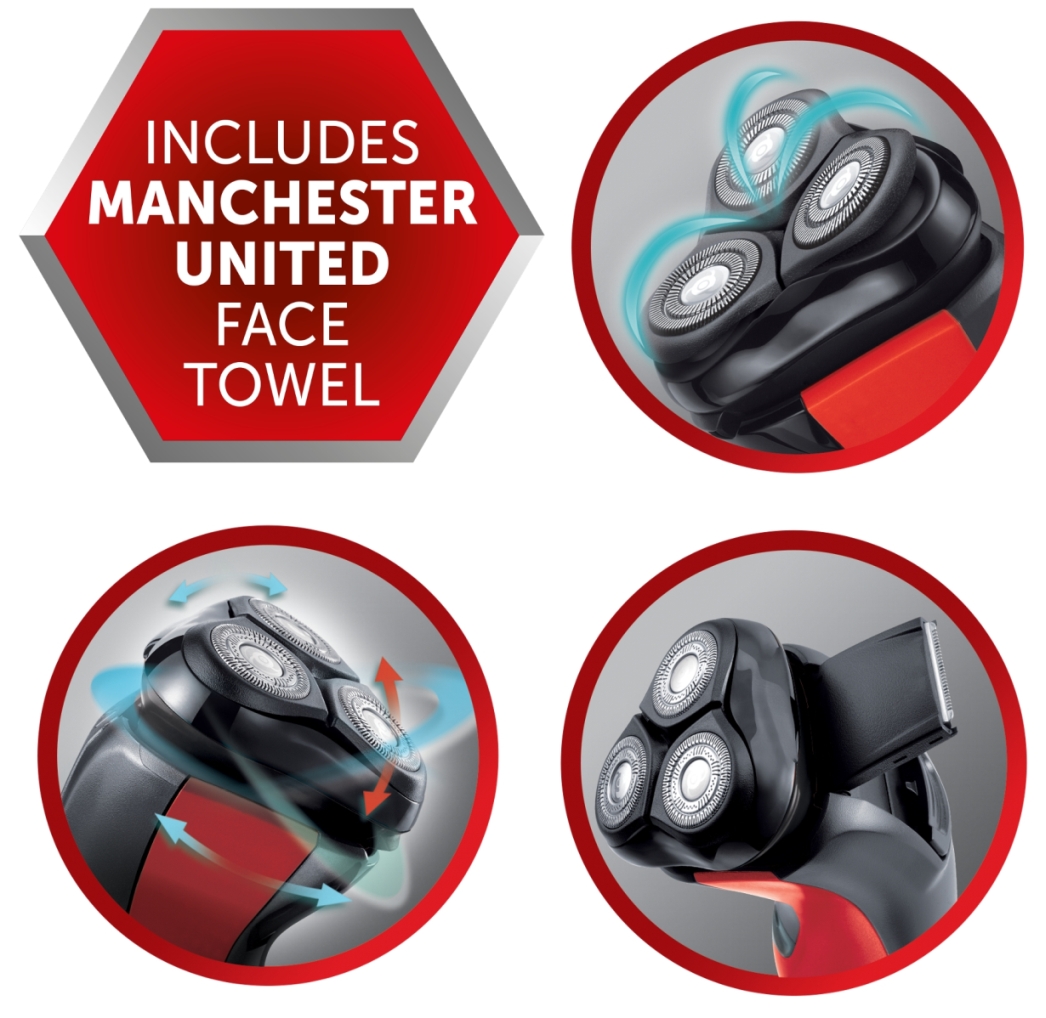 Apparatet er designet med supporteren i bakhodet, med den klassiske Manchester United kronen som påkaller følelser av stolthet og tradisjon hos enhver fan, enten det er hjemme, på tribunen eller på sidelinjene. Comfort Pivot Head – følger ansiktets konturer. Antimikrobiellt belegg for minsket risiko for hudirritasjon. 100% vanntett. Skjærehoder med doble blader– 50% bedre dekning. Pop- up trimmer med avrundede topp.