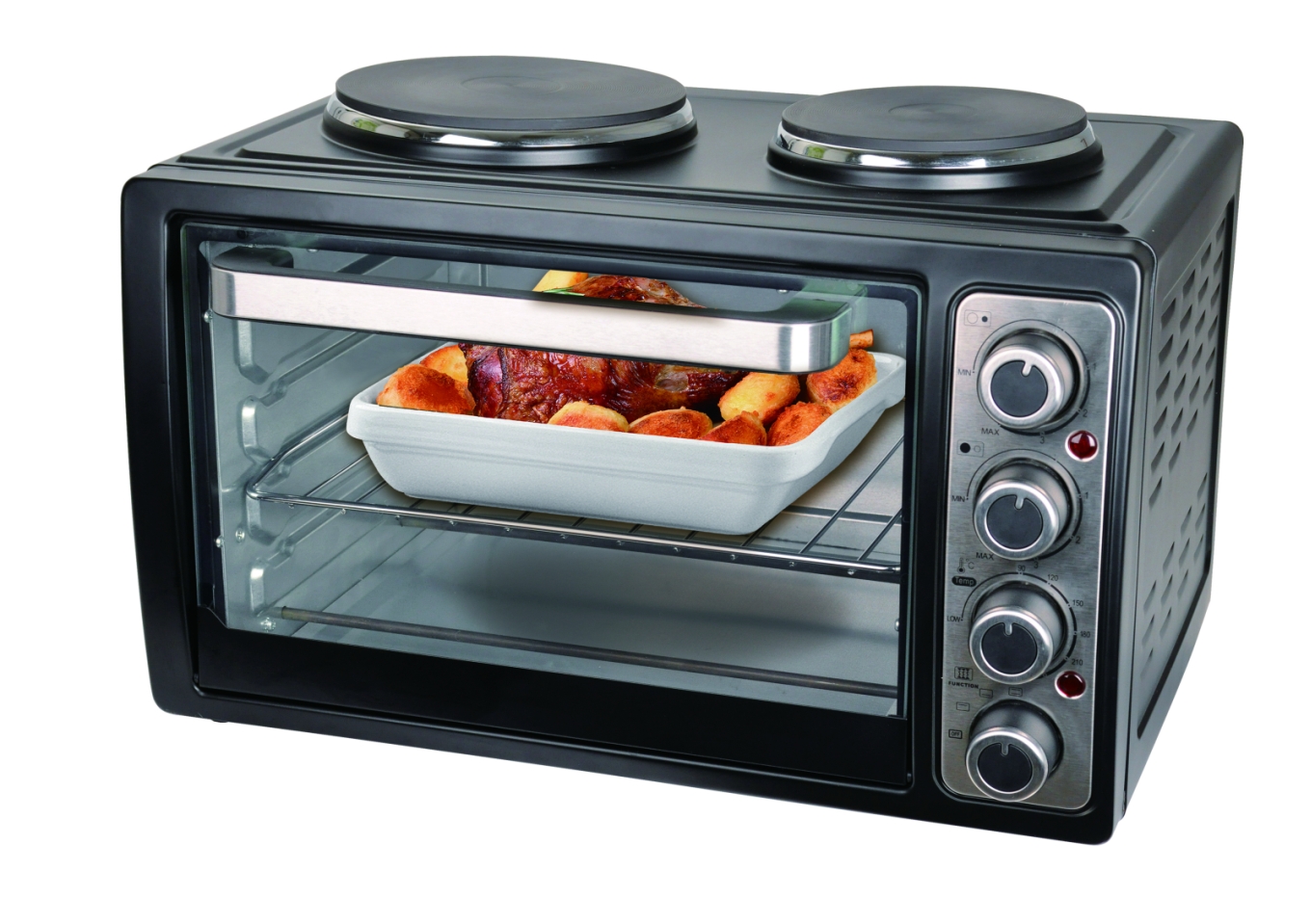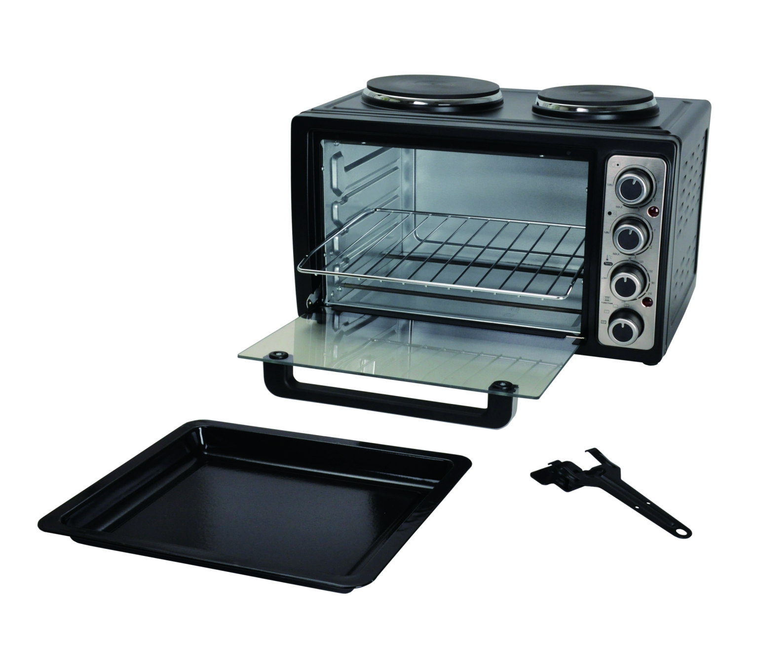 Leveres med langpanne/stekebrett, grillrist og tang. Håndtak og knapper i rustfritt stål, 3 skinner for å sette inn skuffer og grillholdere. Ovnsvolum: 28L / 36x32x24.4cm.